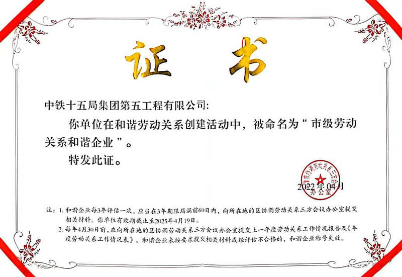 近日,天津市人社局會(huì)同市總工會(huì)、市國(guó)資委、市工商聯(lián)、市企聯(lián)聯(lián)合發(fā)文,命名43戶企業(yè)為市級(jí)勞動(dòng)關(guān)系和諧企業(yè),中鐵十五局集團(tuán)第五工程有限公司榮列其中,可以享受免于勞動(dòng)保障日常巡視檢查等16項(xiàng)政策支持。
