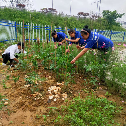 項(xiàng)目部設(shè)點(diǎn)初期,書記何偉和經(jīng)理曹元均主張墻外栽樹種花,墻內(nèi)不規(guī)則小型地塊種菜點(diǎn)綴。他們不約而同地把東北角一小塊空不規(guī)整的空地做了特批,地面不要硬化,作為食堂專用的一塊試驗(yàn)田。夏天來了,小菜園變成“菜籃子”工程。工作在項(xiàng)目部的員工,抬頭欣賞背靠中梁山的自然風(fēng)光,低頭體驗(yàn)項(xiàng)目部的小菜園采摘風(fēng)情。