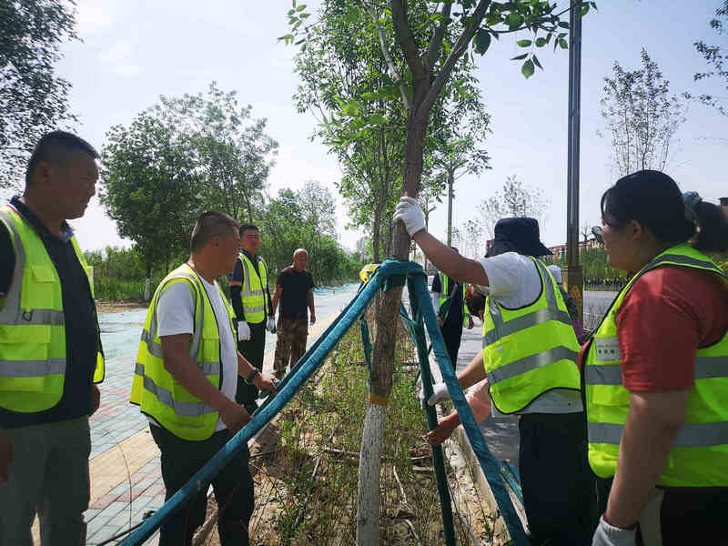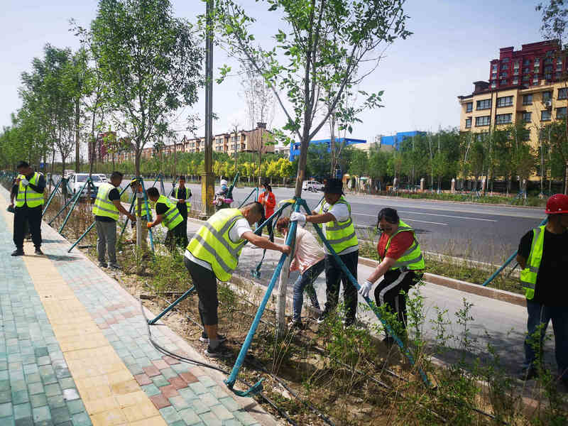 活動以推進項目文明施工實踐為主要形式,在黨支部書記鄭秋博同志的帶領(lǐng)下,項目黨員、青年職工帶著鐵架、支撐架,布袋等物品赴五家渠迎賓大道開展環(huán)保實踐活動。植樹現(xiàn)場,黨員干部和青年職工熱情洋溢,干勁十足,根據(jù)各自任務(wù)分工,使扶樹、培土、支護各項環(huán)節(jié)銜接有序,配合默契,呈現(xiàn)出一派繁忙的景象,在大家4個多小時的努力下,圓滿完成1.2公里的植樹任務(wù)。