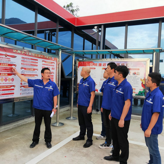 項(xiàng)目部書(shū)記何偉帶領(lǐng)黨員干部學(xué)習(xí)上墻上欄的黨風(fēng)廉政建設(shè)重要教育內(nèi)容