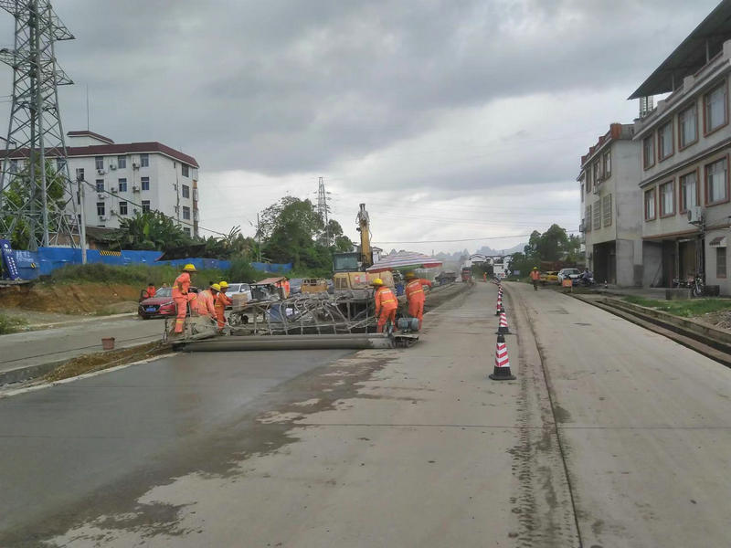 賀州訊(通訊員 朱寶亮)端午節(jié)前,賀州至富川公路二期(賀街至蓮塘段)項目施工現(xiàn)場一片繁忙,水穩(wěn)攤鋪機、壓路機、混凝土三輥軸攤鋪機、挖掘機、抹光機、運輸車等機械設(shè)備在路段穿梭不停,由于正值雨季,項目一線施工人員搶抓晴好天氣,正忙著水穩(wěn)攤鋪、混凝土路面施工,決戰(zhàn)120天,為9月底主體通車任務(wù)奠定基礎(chǔ)。
