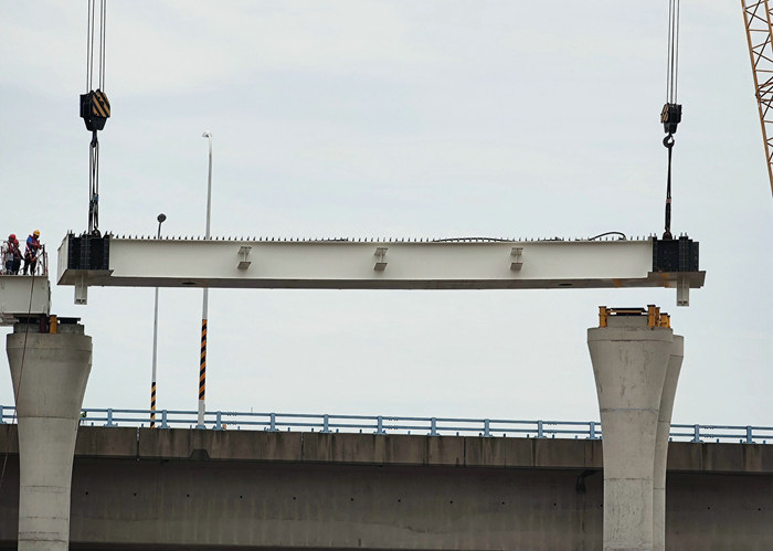 為了做好這次大規(guī)模架梁準備工作,該項目部有關人員在做好大量調(diào)研工作的基礎上,編寫了嚴密的架梁實施方案,主持召開了由寧波市高等級公路建設管理中心、金塘大橋管理局,寧波市海事局等單位專家參加的方案評審會,根據(jù)專家提出的意見和建議進行修改定稿,然后再提交專家評審會評審,獲得一致通過。由于G匝道橋鋼箱梁均為弧形,超寬,公路運輸安全隱患多,項目部慎重決定,從水上運輸,經(jīng)與寧波市海事局、石化區(qū)管委會協(xié)商同意,貨船將鋼箱梁運至管委會碼頭卸下,直接裝上大卡車運至現(xiàn)場。同時,督導舟山長虹鋼結構有限公司組織人員加班加點切割、焊接鋼板,給成型的鋼箱梁拋光、上漆,完成后續(xù)工序,加快鋼箱梁生產(chǎn)進度。