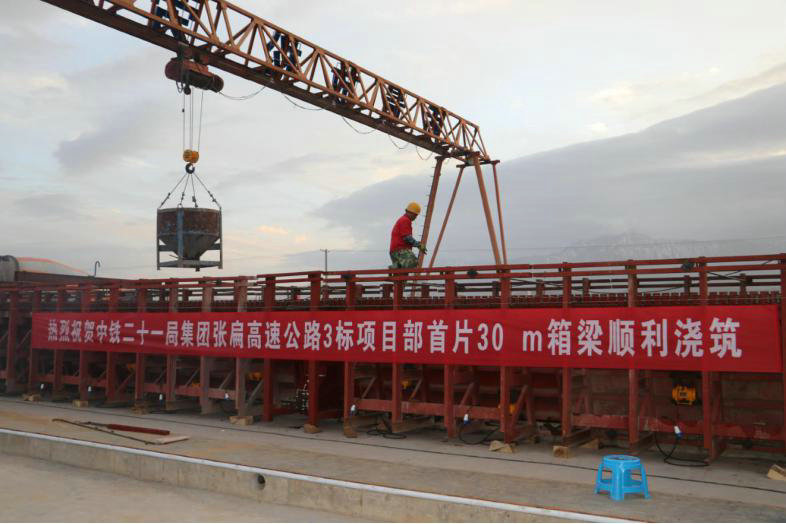 9月19日下午19:08分,中鐵二十一局四公司張扁高速公路項目部洪水河大橋30米箱梁預制施工現(xiàn)場鞭炮齊鳴、禮花齊放,歡慶第一片箱梁預制成功,這標志著整體施工進度取得重大進展,同時為后續(xù)箱梁預制積累了豐富的實戰(zhàn)經(jīng)驗。