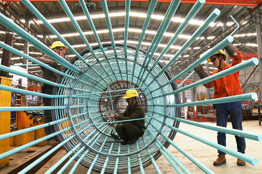 進(jìn)入7月份,位于杭州灣的寧波杭甬復(fù)線濱?;ネńㄔO(shè)工地,氣溫持續(xù)升高,36度以上的天氣居多,鋼棧橋上溫度高達(dá)60度,熱浪滾滾,空氣像著了火一樣?;鹄崩钡奶栔丝局谑┕さ拿恳粋€員工,他們的身體完全被熱浪包圍著。為了避免胳膊被強(qiáng)烈的陽光燙傷,那個員工都不敢穿短袖衣服,在工地見到的都是一色的長袖工作服。在A匝道,5名臉膛黢黑的工人正在配合吊車,將焊接好的直徑2米、長12米的鋼筋籠不偏不倚沉降到清理干凈的鋼護(hù)筒里,下到一定位置時,垂直 的鋼筋籠與另一個鋼筋籠相接。84米深的樁孔,需要連接7個鋼筋籠,用套筒螺帽固定。工人們揮汗如雨,衣服被汗水濕透了,身上黏糊糊的,他們一邊用衣袖擦汗,一邊麻利地一圈一圈擰套筒螺帽。在F匝道,一臺吊車將一塊鋼模吊起來移到16號墩的20多米高處,這是在進(jìn)行模具安裝作業(yè),幾名腰間拴著保險繩的工人馬上用螺桿螺帽固定,配合默契,不消半個小時,圍繞墩柱鋼筋籠四周便安裝好了模具。一名工人拿出隨身帶的茶水,一口氣將半瓶水喝干。