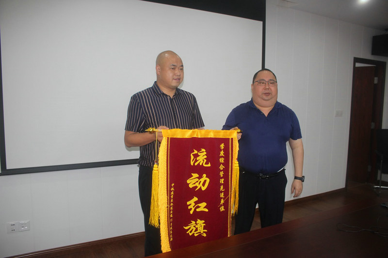 中鐵建重慶軌道交通15號(hào)線總承包部指揮長李兵(右)為項(xiàng)目部獲得總承包部二季度綜合管理先進(jìn)單位授錦旗
