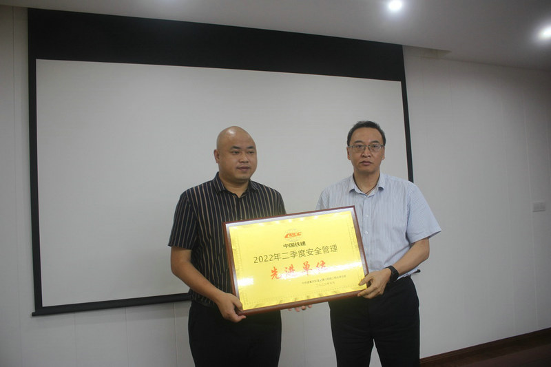 中鐵建重慶軌道交通15號(hào)線總承包部黨工委副書記王向平(右)為項(xiàng)目部獲得二季度安全管理先進(jìn)單位頒發(fā)獎(jiǎng)牌