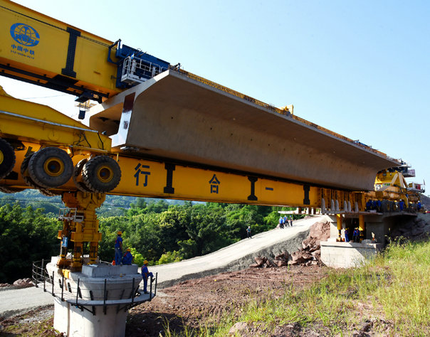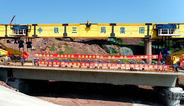 7月10日上午,位于宜賓市的中鐵三局渝昆高鐵站前六標架梁施工現(xiàn)場,在39度的高溫天氣下,隨著指揮人員一聲令下,首榀長達32米、重達800噸的雙線箱梁穩(wěn)穩(wěn)地架設在李家村3號大橋3#-4#橋墩上,拉開了渝昆六標箱梁架設序幕,正式開啟“架梁模式”。