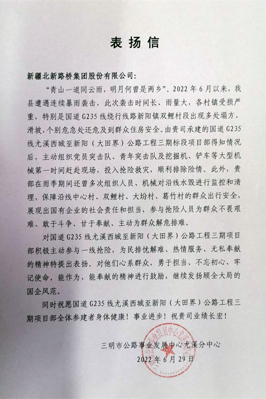 尤溪訊(通訊員 劉小波)近日,北新路橋集團(tuán)長(zhǎng)沙分公司國(guó)道G235線尤溪西城至新陽(yáng)(大田界)公路工程三期項(xiàng)目部收到來(lái)自福建省三明市公路事業(yè)發(fā)展中心尤溪分中心的表?yè)P(yáng)信,表?yè)P(yáng)該項(xiàng)目部在6月份暴雨襲擊尤溪縣時(shí),用行動(dòng)彰顯責(zé)任、用擔(dān)當(dāng)詮釋使命,敢作為、能奉獻(xiàn)、顧大局的精神。