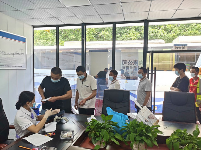 項(xiàng)目部聯(lián)合重慶兩江新區(qū)第一人民醫(yī)院禮嘉分院開展“健康進(jìn)工地,夏日沁人心”體檢活動(dòng),為一線工人進(jìn)行體檢,對(duì)患有高血壓、恐高癥人員不安排高空作業(yè)。并針對(duì)隧道施工粉塵危害大的情況,項(xiàng)目嚴(yán)格要求作業(yè)人員作業(yè)時(shí)不管天氣炎熱必須佩戴個(gè)人安全防護(hù)用品,同時(shí)采用噴淋設(shè)備,對(duì)現(xiàn)場(chǎng)粉塵進(jìn)行處理,保障作業(yè)環(huán)境安全可控,確保工人身體健康,穩(wěn)步推進(jìn)施工生產(chǎn)。