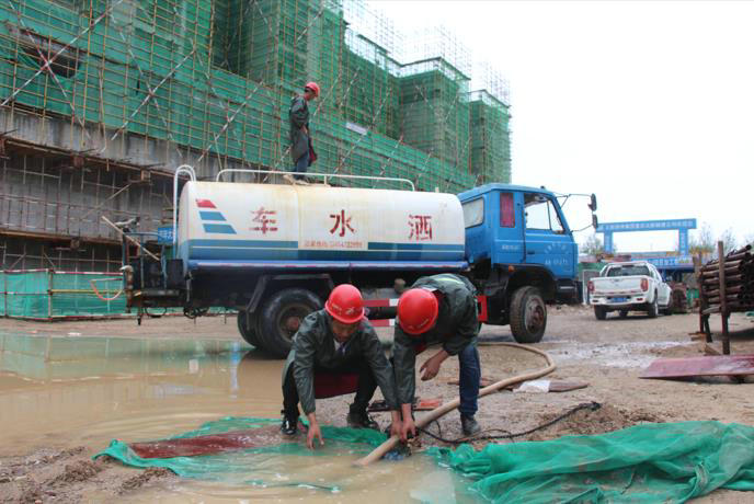 在巡查發(fā)現(xiàn)基坑積水情況,該項(xiàng)目立即安排人員及設(shè)備進(jìn)行抽排,疏通基坑四周排水溝并加固土壟,最后覆蓋防水雨布進(jìn)行遮擋;同時(shí),在施工駐地活動(dòng)板房周圍環(huán)鋪塑料布,填充、堆疊防汛沙袋,防止流水持續(xù)侵蝕地基。經(jīng)過四個(gè)小時(shí)雨中“搶險(xiǎn)”,成功消除安全隱患。