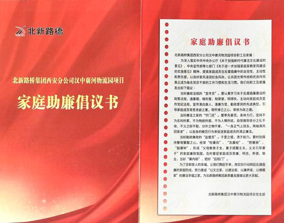 家風(fēng)清則作風(fēng)正,家風(fēng)廉則黨風(fēng)端。為聚焦發(fā)揮反腐倡廉“大后方”的作用,突出家庭在推動(dòng)黨風(fēng)廉政建設(shè)中的重要地位。近日,北新路橋集團(tuán)西安分公司漢中褒河物流園項(xiàng)目結(jié)合第二十四黨風(fēng)廉政月活動(dòng)積極開展家庭助廉行動(dòng),以清正廉潔家風(fēng)筑牢拒腐防變堅(jiān)固堡壘。