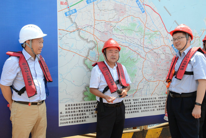寧波市高等級(jí)公路建設(shè)管理中心副主任徐愛(ài)敏、寧波市交通局建管處處長(zhǎng)葉昌勇、浙江省交投交通建設(shè)管理有限公司副總經(jīng)理?xiàng)畛砂?、監(jiān)理公司總監(jiān)章華鋒等陪同。