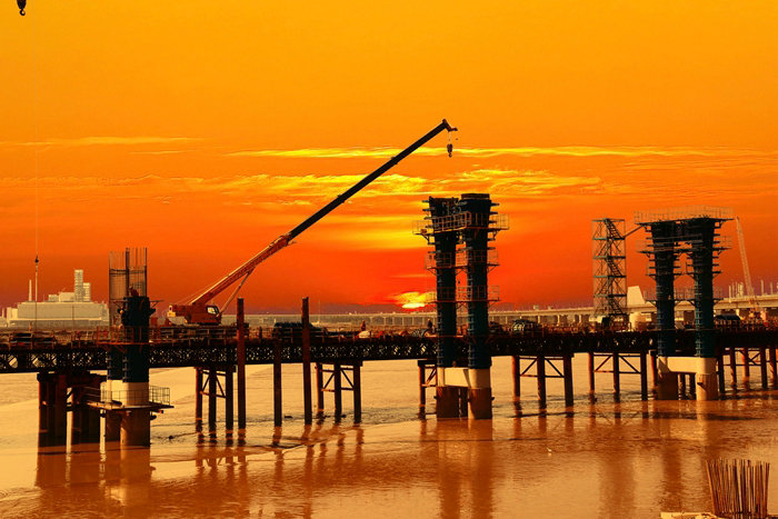 杭甬項(xiàng)目濱?;ネㄕ加煤S蛎娣e613.03畝,是連接甬舟高速公路的海上互通立交橋,由主線橋、4座拼寬橋和8條匝道橋組成,全長10090米,是目前亞洲最大的海上互通樞紐,浙江省、寧波市的重點(diǎn)建設(shè)項(xiàng)目,是一期5個標(biāo)段中的“瓶頸”工程,下跨輸油管道、新奧燃?xì)狻?00千伏海纜等多條海底管線,3次上跨、4次下穿金塘大橋。濱?;ネㄔO(shè)計(jì)鉆孔樁1027根,平均樁長83米。去年初全面開工建設(shè)以來,該項(xiàng)目部采取棧橋先行的辦法,為鋼護(hù)筒運(yùn)輸、海上加工鋼筋籠、鉆孔泥漿反循環(huán)、堆放鋼筋籠、分節(jié)插打直徑1.8米到2.5米的鋼護(hù)筒等樁基施工搭建了平整、穩(wěn)固的平臺。去年下半年根據(jù)施工需要,架設(shè)鋼棧橋與插打鋼護(hù)筒、鉆孔、下鋼筋籠、灌注混凝土等多道工序同時(shí)展開,形成遍地開花、多點(diǎn)擊破的“聯(lián)合作戰(zhàn)”陣勢,穩(wěn)步向前推進(jìn)。