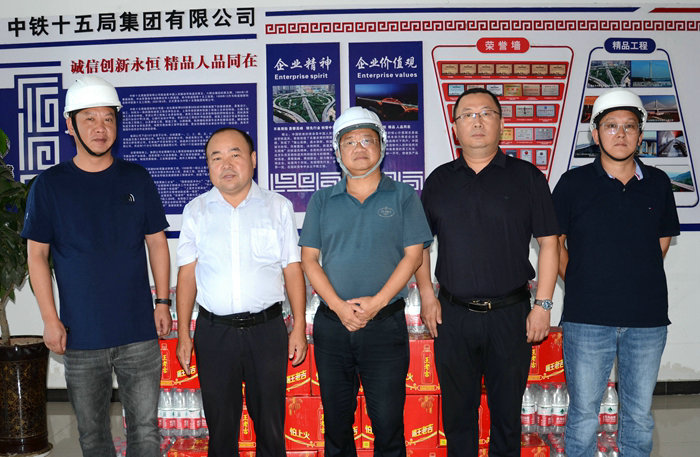 8月16日下午,寧波市鎮(zhèn)海區(qū)建設(shè)交通局總工程師王洲偉帶著礦泉水、王老吉等飲品到中鐵十五局集團(tuán)杭甬項(xiàng)目部慰問。