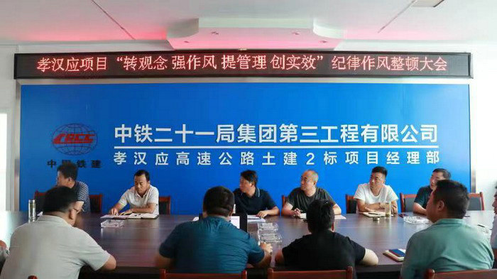 本網(wǎng)湖北孝感8月22日訊(通訊員 賈瑛)8月20日,為全面整治項(xiàng)目全體干部職工近期在作風(fēng)方面存在的突出問題,進(jìn)一步轉(zhuǎn)變觀念、強(qiáng)化作風(fēng)、提高效率、規(guī)范管理,進(jìn)一步增強(qiáng)紀(jì)律規(guī)矩意識(shí),筑牢思想防線,中鐵二十一局三公司孝漢應(yīng)項(xiàng)目部組織全體職工召開“轉(zhuǎn)觀念 強(qiáng)作風(fēng) 提管理 創(chuàng)實(shí)效”紀(jì)律作風(fēng)整頓大會(huì)。