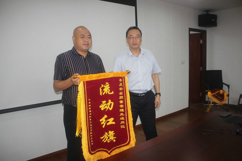 總承包部黨工委副書記王向平(右)給獲總承包部二季度“安全質(zhì)量管理先進崗位”授錦旗
