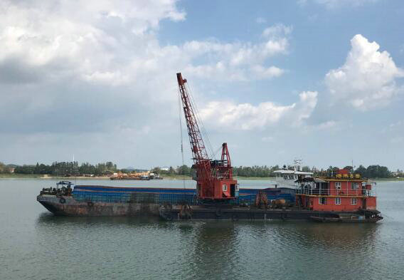 為了保證圍堰順利下水,河床清淤是當(dāng)前首要任務(wù),為此項(xiàng)目部引進(jìn)了具有GPS精確定位的抓斗船2艘,500噸運(yùn)輸船1艘,并且安排專人值守保證24小時(shí)不間斷作業(yè),確保主墩位置河床淤泥、石渣清理徹底,為后續(xù)圍堰下水打下堅(jiān)實(shí)的基礎(chǔ)。項(xiàng)目部要求抓斗船在水上施工作業(yè)中嚴(yán)格遵循文明與環(huán)保施工措施,清理出來的淤泥在岸邊指定的位置堆棄,防止污染巴河水域。石渣則用于項(xiàng)目便道填筑、路堤本體填料等項(xiàng)目,達(dá)到變廢為寶的目的。