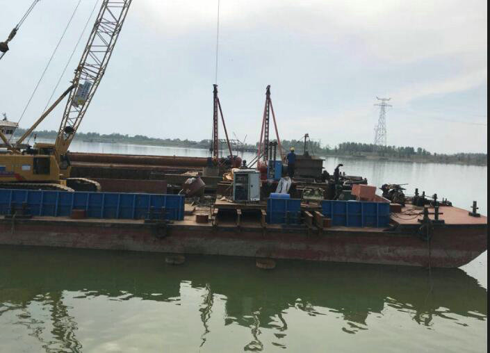 浠水側(cè)鋼棧橋隨著工程推進(jìn),遇到了“攔路虎”,該段地質(zhì)復(fù)雜,河底均為大塊鵝卵石,硬度很高,鋼管樁難以打入。根據(jù)評審?fù)ㄟ^的專項施工方案,當(dāng)鋼管樁達(dá)不到入巖深度6.5米要求時,管樁基礎(chǔ)施工采用“沖孔栽樁”的工藝進(jìn)行沖孔作業(yè),保證整個棧橋結(jié)構(gòu)的整體穩(wěn)定性。