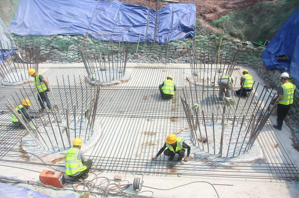 17標(biāo)工人在綁扎廖家溪軌道引橋承臺(tái)鋼筋