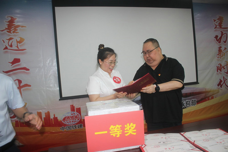 總承包部指揮長李兵(右)為一等獎獲得者張煥芹頒獎
