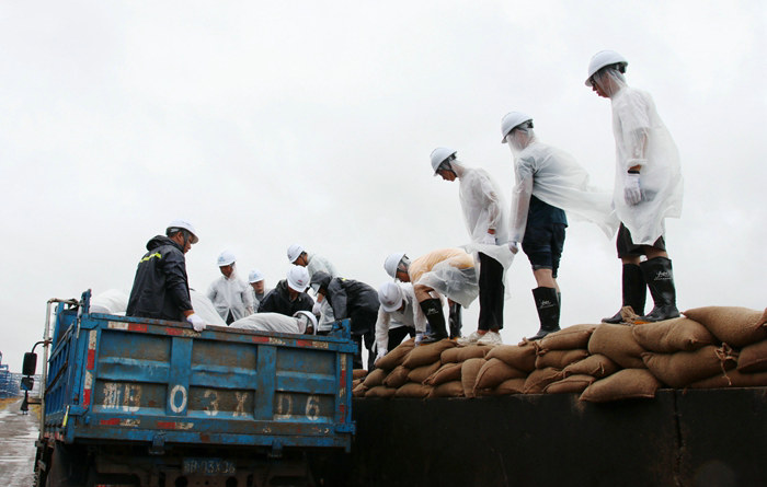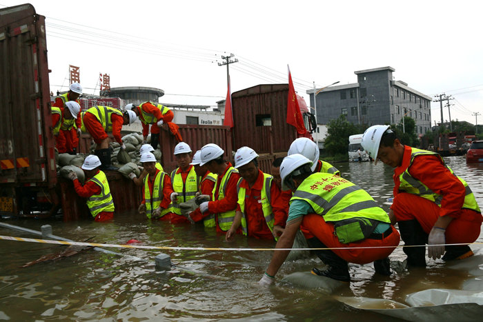 同時,項目黨支部充分發(fā)揮戰(zhàn)斗堡壘作用,在鎮(zhèn)海、海曙區(qū)政府和駐地群眾需要時,踐行央企責任。2021年7月“煙花”和9月“燦都”兩次臺風途徑寧波,項目黨支部積極組織黨員提前做好預防,加固無法撤離的設備,轉(zhuǎn)移安置上千名員工。在臺風來襲過程中和臺風過后,由19名黨員帶頭、普通員工參加的搶險突擊隊,冒著狂風暴雨奔赴石化區(qū)加固防洪堤壩,堆碼沙袋1公里,遏制了海水侵襲。當古林鎮(zhèn)一片汪洋,10萬名群眾生產(chǎn)、生活被洪水圍困之時,該項目由黨員領(lǐng)銜的突擊隊出現(xiàn)在古林街頭,在齊腰深的洪水中用沙袋將涌水擋在高墻外,保護了群眾的生命安全,寧波市交通局、鎮(zhèn)海石化區(qū)管委會、古林鎮(zhèn)等多家政府部門送來錦旗和表揚信。