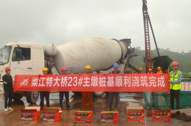 10月5日上午,隨著最后一車混泥土的澆筑,由北新路橋集團北新融建公司承建的重慶雙錢高速公路土建施工SQTJ1標段渠江特大橋23#主墩樁基順利澆筑完成,標志著渠江特大橋東岸主墩樁基全部完成澆筑,東岸順利完成第一道工序,下一步將有序推進圍堰及承臺基坑施工。