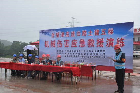 9月28日,“十一”國慶前夕,為切實(shí)做好節(jié)日期間的安全生產(chǎn)工作,結(jié)合實(shí)際工作計(jì)劃,合璧津高速公路土建五標(biāo)組織開展了機(jī)械傷害應(yīng)急演練活動(dòng)。合璧津高速公路第二總監(jiān)辦領(lǐng)導(dǎo)、龍華鎮(zhèn)政府領(lǐng)導(dǎo)及龍華鎮(zhèn)中心醫(yī)院醫(yī)務(wù)人員出席活動(dòng)。35名項(xiàng)目管理及施工人員參加此次活動(dòng)。
