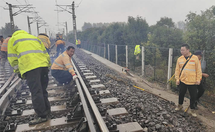 在王寨站北段道岔,淅瀝瀝的小雨下個(gè)不停。兩臺(tái)搗固車(chē)機(jī)器轟鳴地作業(yè)著,十幾名職工緊跟搗固車(chē)后面檢查質(zhì)量、回填道床。三堂集維修工區(qū)工長(zhǎng)胡守峰俯身跪在鋼軌上指揮起道,大機(jī)搗固不到的地方需要人工起道進(jìn)行補(bǔ)搗。六名職工雙手緊握內(nèi)燃搗鎬,在胡守峰起好道后,內(nèi)燃機(jī)械“嗡嗡”地噴著白煙,震動(dòng)著石砟擠進(jìn)枕底。雖說(shuō)是冒雨施工,然而現(xiàn)場(chǎng)卻呈現(xiàn)出一派熱火朝天的景象。