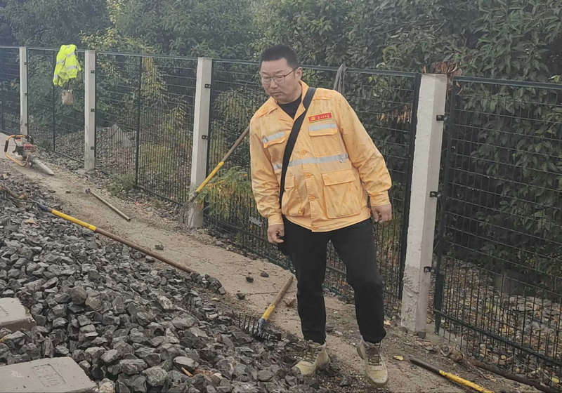 小雨下個(gè)不?!,F(xiàn)場(chǎng)中,二十多名職工冒雨緊張地作業(yè)著。二個(gè)多小時(shí)的封鎖天窗,要完成三組道岔的配合作業(yè),時(shí)間緊,任務(wù)重,必須爭(zhēng)分奪秒同時(shí)間賽跑。胡守峰指揮起道后,就緊跟從職工手中接過(guò)內(nèi)燃搗鎬。三堂集維修副工長(zhǎng)張向陽(yáng)放下道尺,拿起拉耙整理道床。操作手不使用起道機(jī)就幫忙回填道床,作業(yè)人員個(gè)個(gè)爭(zhēng)先恐后,為全面完成施工任務(wù),確保安全正點(diǎn),心向一處想,勁向一處使。