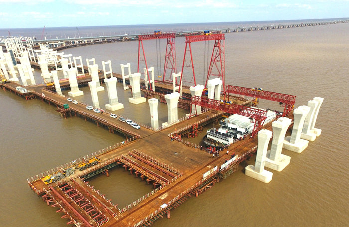 杭甬復線濱?;ネㄊ莵喼拮畲蟮暮I匣ネ屑~,由2390米主線橋、4座1320米拼寬橋、8座5995米匝道橋、634座墩柱、493片鋼混箱梁構(gòu)成。鋼箱梁生產(chǎn)、架設(shè)是濱?;ネê笃谑┕さ?ldquo;重頭戲”,受到浙江省各級政府、業(yè)主、交通等多方的高度關(guān)注。根據(jù)集團公司的要求,2021年10月底開始生產(chǎn)第一片梁,為如期完成任務(wù),該項目前期做了大量艱苦細致的工作,組織有關(guān)人員起草方案,并進行反復修改確保安全、質(zhì)量、進度的可行性方案,多次召開由多名橋梁、水利、海洋專家組成的方案評審會,選定了鋼箱梁生產(chǎn)廠家,敲定了生產(chǎn)、運輸、裝卸、架設(shè)等多項方案,為加速推進每一項方案的落地做了充分準備。與此同時,該項目指派管理、技術(shù)人員現(xiàn)場指導,于2021年10月29日提前兩天在舟山進行20米—60米的鋼箱梁生產(chǎn),12月29日在濱海互通架設(shè)第一片梁。其次,同步將加工制作成20噸到30噸的鋼箱梁再鋪設(shè)鋼筋網(wǎng)、澆筑混凝土,變成130噸—170噸的疊合梁,生產(chǎn)過程有條不紊。由299片鋼箱梁加工成鋼混疊合梁,用貨船從舟山經(jīng)過數(shù)小時的航運,抵達杭甬濱?;ネㄐ读赫?,再由大卡車運至提梁站,由兩個大型龍門吊將一片片梁安裝到橋墩上。