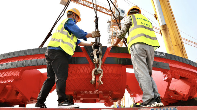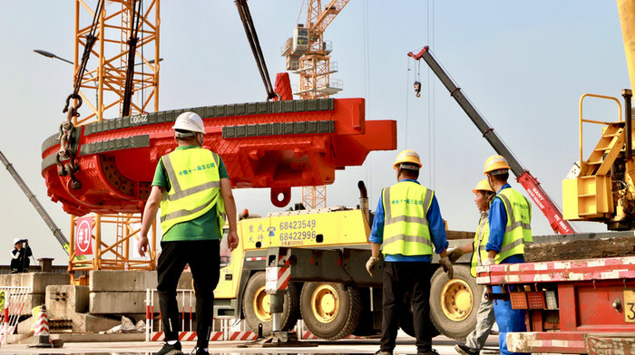 S841盾構(gòu)機(jī)為復(fù)合式土壓平衡盾構(gòu)機(jī),全長(zhǎng)106米,重1054噸,刀盤直徑8.83米,由刀盤、盾體、盾尾、管片拼裝機(jī)、螺旋運(yùn)輸機(jī)及配套臺(tái)車等部分組成,盾體分四塊安裝。