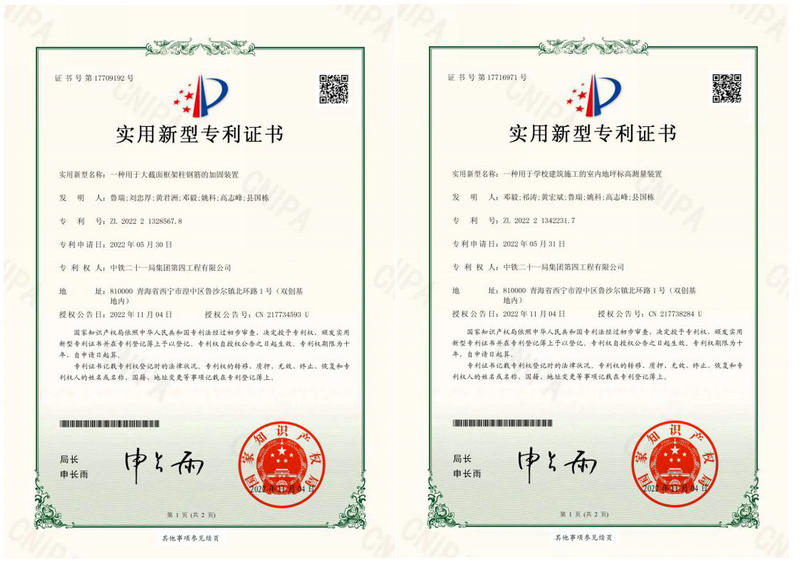 近日,由中鐵二十一局四公司南川工業(yè)園區(qū)九年一貫制學(xué)校建設(shè)項目部申報的《一種用于大截面框架柱鋼筋的加固裝置》與《一種用于學(xué)校建筑施工的室內(nèi)地坪標(biāo)高測量裝置》兩項專利喜獲國家知識產(chǎn)權(quán)局頒發(fā)的實(shí)用新型專利證書,填補(bǔ)了項目部在專利成果方面的空白。