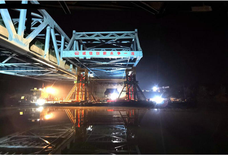 11月6日,經(jīng)過15小時(shí)50分鐘的連續(xù)奮戰(zhàn),中鐵一局京滬高速公路HA4標(biāo)項(xiàng)目鹽河大橋主跨長(zhǎng)95米、重1450噸的鋼桁梁精準(zhǔn)就位于接收端支架,這是繼去年右幅鋼桁梁順利浮拖過河又一次對(duì)鋼桁梁浮拖施工技術(shù)的進(jìn)一步驗(yàn)證及提煉,同時(shí)標(biāo)志著本項(xiàng)目橋梁重難點(diǎn)工程施工全部完成。