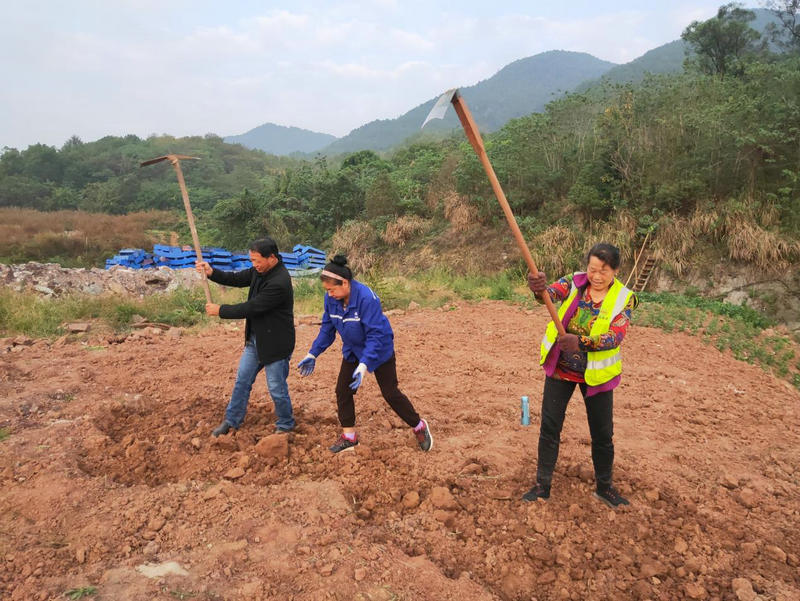 項(xiàng)目部勤雜工張鳳玲(中)、王坤蘭和小車(chē)司機(jī)龔世民在棄土場(chǎng)刨地