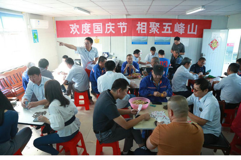 10月1日早,最令職工們喜聞樂(lè)見(jiàn)的“摜蛋”活動(dòng)拉開(kāi)帷幕,有“固定搭檔”早已虛席以待,“夫妻搭檔”的牌桌上一片歡聲笑語(yǔ),綜合辦公室人員端上了花生、瓜子,備好了冬棗、金橘,掛上了“歡度國(guó)慶節(jié),相聚五峰山”的條幅,營(yíng)造出職工與家屬齊聚一堂,共享闔家歡樂(lè)的氛圍。激烈的“摜蛋”比賽一直持續(xù)到晚上,在廝殺到第五輪之后終于決出了冠亞軍。