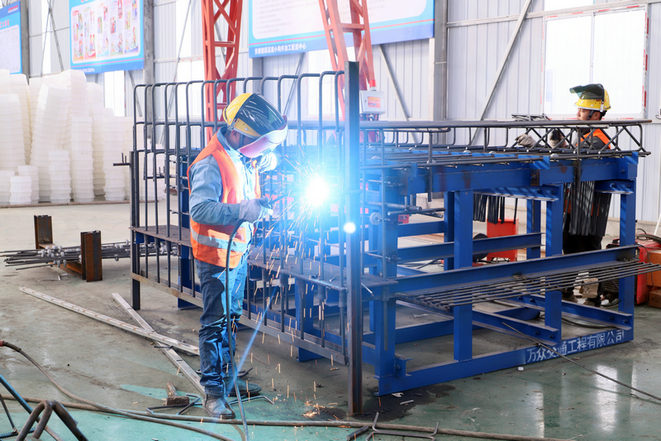 (北新路橋集團(tuán)安徽宿固高速土建二標(biāo)施工現(xiàn)場進(jìn)行預(yù)制箱涵側(cè)墻鋼筋骨架制作。孫夢凱攝。)