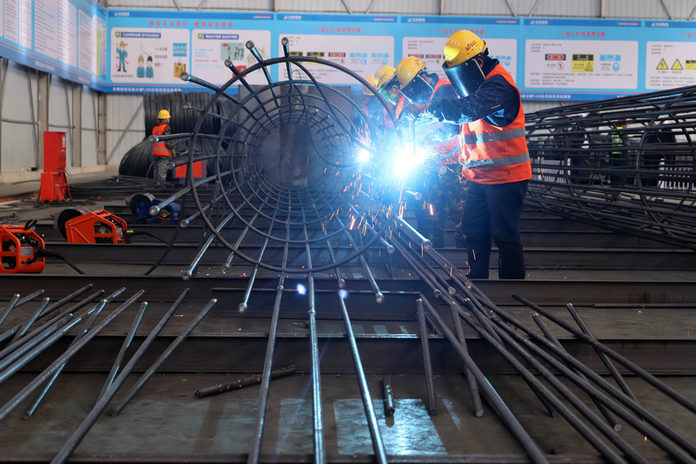 (北新路橋集團(tuán)安徽宿固高速土建二標(biāo)施工現(xiàn)場進(jìn)行樁基鋼筋籠焊接。孫夢凱攝。)