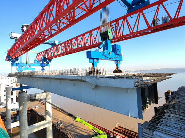 濱?;ネㄈL9705米,由4座拼寬橋、8座匝道橋組成,設(shè)計墩柱634座、鋼箱梁194片、疊合梁299片。鋼箱梁和疊合梁長20米—50米,20噸——190噸。為實現(xiàn)集團公司主管領(lǐng)導提出的2021年底架設(shè)第一片梁的目標,該項目部經(jīng)過充分調(diào)研和論證,在選好鋼箱梁生產(chǎn)廠家之后不久,又選擇一個生產(chǎn)疊合梁的施工隊,鋼箱梁與疊合梁生產(chǎn)同步進行,11月底生產(chǎn)出第一片梁。從舟山到寧波海上運梁復雜手續(xù)辦妥后,實施海上運梁計劃,鋼箱梁運至鎮(zhèn)海石化管委會碼頭,再倒運至工地,12月29日架設(shè)第一片鋼箱梁。為節(jié)省成本、提高工效,該項目部實施第二個計劃,即建成1座卸梁站和2座提梁站,利用存梁平臺、龍門吊、履帶吊等設(shè)施和設(shè)備架設(shè)鋼箱梁和疊合梁。由于拼寬段橋梁上部結(jié)構(gòu)不規(guī)則,架設(shè)難度大,疊合梁長且重量在150噸—190噸之間,現(xiàn)有設(shè)備架梁安全風險高,難以滿足進度需要。該項目部經(jīng)過慎重考慮,決定租賃兩臺自重各215噸、長66米、寬12米、高11.4米的架橋機用于架設(shè)疊合梁。這兩臺由支腿、主梁、兩臺提梁天車等組合而成的軌道式預制梁吊裝架橋機,性能好、操作方便安全,能滿足大坡度、小半徑彎橋、斜橋架梁要求,一次可承載200噸的橋梁。具體操作方法是,由提梁站龍門吊將疊合梁吊至20多米高處的自平衡運梁車上,再推送到架橋機上,在指揮人員指導下,架橋機載著梁體緩緩向前移動到指定位置,然后安放就位。