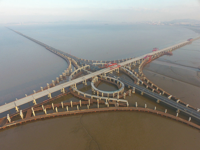 杭甬復線濱?;ネㄔO計呈苜蓿葉狀,設主線橋、拼寬橋、8座匝道橋,全長9705米,位于寧波市鎮(zhèn)海區(qū)淺海水域,設1027根樁基、169座承臺、636座墩身,采用花瓶墩和圓柱式墩造型。該互通3次上跨、4次交匯金塘大橋,建成后,是東海海域寧波境內一道雄偉壯觀的人文景觀,將成為寧波市的標志性建筑。