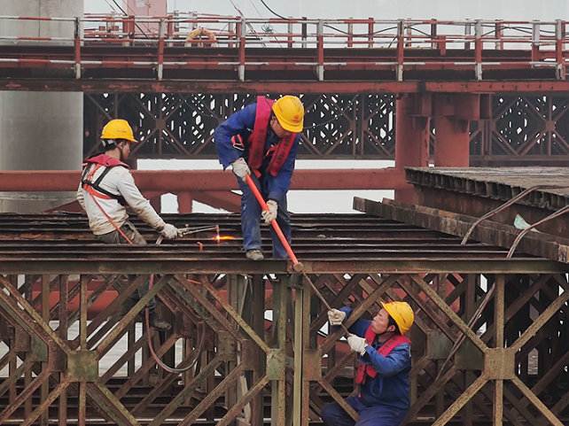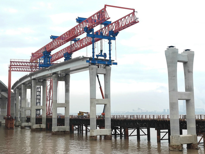 元宵節(jié)前后這段時間,杭州灣地區(qū)與往年相比,雨水激增,杭甬復(fù)線互通位于鎮(zhèn)海區(qū)海域,連綿不絕的雨水給運梁、架梁、拆除棧橋和橋面混凝土施工帶來一定困難。雨水天一個突出特點是,氣溫低、濕滑,有雨必有風(fēng),可謂風(fēng)雨交加?;颐擅傻臍饬骰\罩著氣勢恢宏的濱?;ネ?,動蕩不安的海水越發(fā)不安分。置身于棧橋上、高空橋梁上的員工們經(jīng)受著雨水的“沐浴”,冷得渾身發(fā)抖,可是不到下班時間不能隨便離開。穿上雨衣干活,顯得笨手笨腳,而雨衣常常在施工過程中不小心被釘子、鋼筋劃破,哪個員工的雨衣都有幾個口子,雨水會順著不起眼的裂口流進(jìn)里面的衣服上。這還不算啥,濕漉漉的天氣潛伏著安全隱患才值得警惕。由于腳下的地面都是水,容易滑倒摔傷。但不能因為下雨而停工,除非遇到大雨或暴雨、7級以上大風(fēng),才撤離現(xiàn)場。一般小雨和6級以下風(fēng)力,都要照常施工。季節(jié)性的變化是自然規(guī)律,誰也阻止不了雨水的降臨。為了員工的安全,項目部按照雨天安全管理辦法,由現(xiàn)場負(fù)責(zé)人、安全總監(jiān)、專職安全員每天在工地巡檢,在排除安全隱患的同時,最有效的辦法便是大聲提醒作業(yè)員工,上班要穿防滑鞋,走路要小心,臨水和高空作業(yè)要系好保險繩,不能嫌麻煩、圖省事,要在保證個人的生命安全的前提下進(jìn)行施工。濱?;ネㄊ墙衲晟习肽旯缘闹刂兄?,計劃生產(chǎn)鋼箱梁232片、疊合梁90片,現(xiàn)澆橋面板41聯(lián),安裝防撞欄14472米,完成鋼箱梁架設(shè)142片、疊合梁90片。任務(wù)都分解到各施工隊,規(guī)定了完成任務(wù)的節(jié)點,從項目部到施工隊員工,以不畏難、不怕苦、勇?lián)?dāng)、只爭朝夕的拼搏精神投入到工作中。兩個棧橋隊以每天拆除30多平米棧橋的速度向前推進(jìn)。舟山梁場晝夜不停地生產(chǎn)加工鋼箱梁、疊合梁。橋面施工隊組織機(jī)械和人力緊鑼密鼓地鋪設(shè)鋼筋網(wǎng)、澆筑混凝土。卸梁站、提梁站以及運梁車和兩臺架橋機(jī)的操控人員,在現(xiàn)場管理人員指導(dǎo)下緊張有序地進(jìn)行作業(yè)。