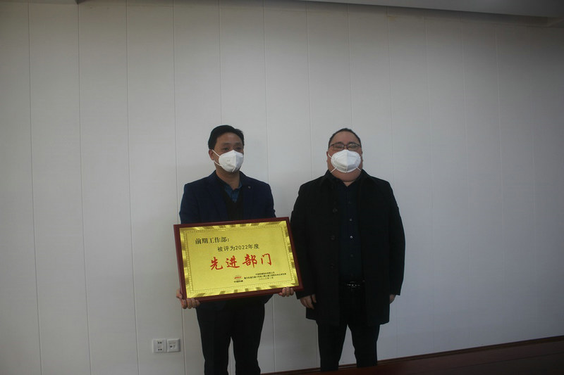 總承包部指揮長(zhǎng)李兵(右)為前期工作部頒發(fā)獎(jiǎng)牌