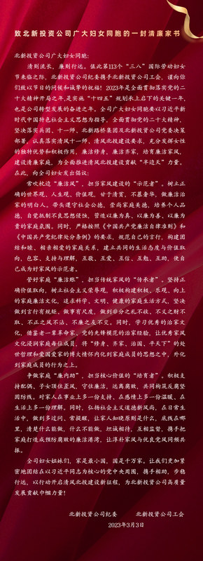 正在閱讀:致北新投資公司廣大婦女同胞的一封清廉家書