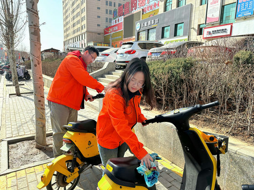 擦洗共享單車(chē)(何璐彤 攝)