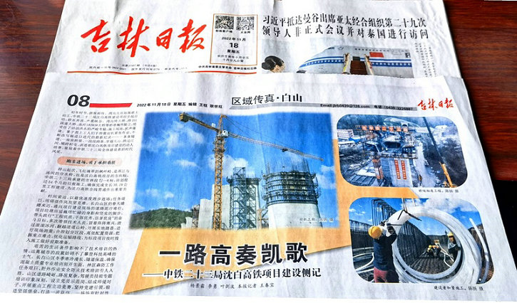 “初冬時節(jié),捷報頻傳。灣溝北站站場破土動工,中鐵二十三局沈白高鐵建設項目全線啟動;碧水奔流,聲震峽谷。灣溝特大橋、跨201國道大橋、湯河1#2#3#大橋等橋墩巍然挺立,經受住了滔滔洪水的嚴峻考驗;施工現(xiàn)場,機聲隆隆。掌子面上工人們手持鑿巖機緊張作業(yè),不斷改寫掘進日進尺的最新紀錄……一條條隧道、一座座橋梁、一段段路基,穿越大山、跨過江河、橫跨村屯,講述著沈白高鐵項目建設的動人故事,展現(xiàn)著中鐵二十三局全體建設者的時代風采。”這是長篇通訊《一路高奏凱歌》的“開場白”。