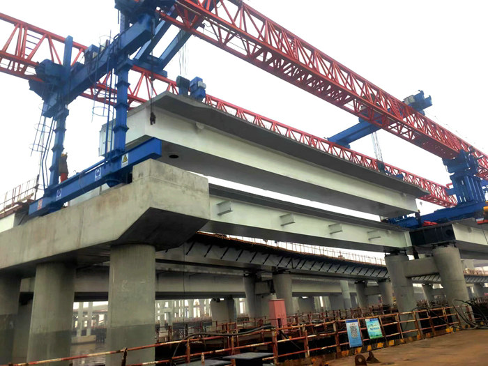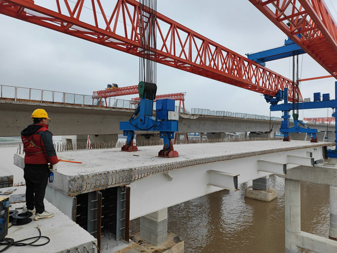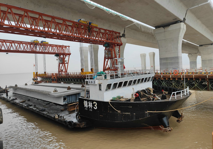 該項目濱?;ネㄊ讞l匝道——C匝道3月5日率先架通,全長467.42米、32片梁的E匝道架設(shè)完成,5條匝道累計架梁211片,以每天3——6片的速度向前延伸。該項目部在制梁、船運、提梁、架設(shè)等方面擁有了掌控互通樞紐上部結(jié)構(gòu)施工管理和技術(shù)的經(jīng)驗,為后續(xù)架梁提速奠定了基礎(chǔ)。