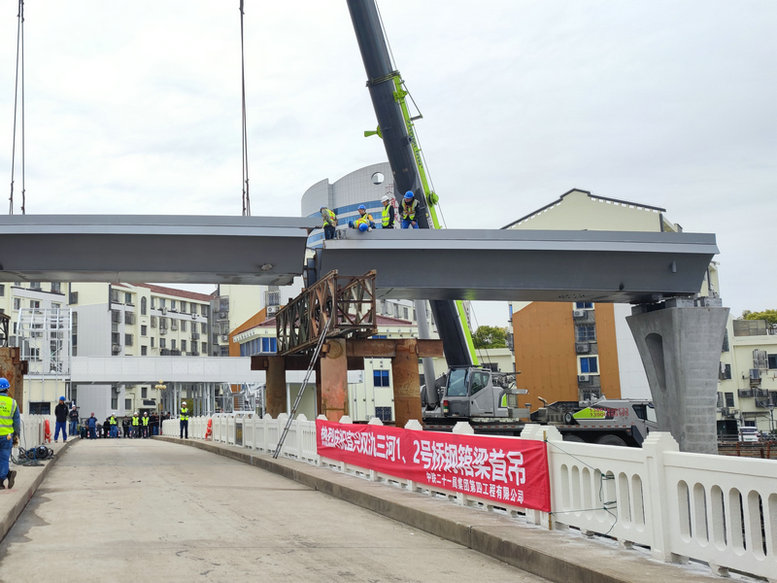 3月24日,由中鐵二十一局四公司承建的宜興雙氿三河1、2號橋項目第一跨鋼箱梁吊裝施工在宜興市宜城街道錦繡新村首吊安裝圓滿成功。