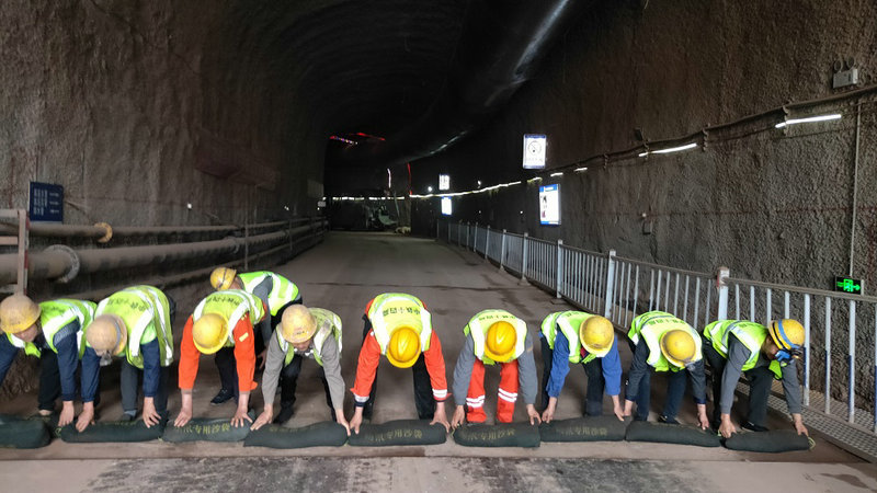 此次防洪演練模擬內(nèi)容為,中梁山隧道進口因近期持續(xù)降雨,洞口及棄土場區(qū)水位上漲、積水增加的趨勢,隨時可能發(fā)生洪水倒灌隧道洞口,現(xiàn)場安全總監(jiān)立即向項目經(jīng)理報告現(xiàn)場情況,一方面開展人員撤離,另一方面組織人員堆碼沙袋、疏散警戒、人員應(yīng)急搶險等模擬演練。目的是檢驗隧道施工人員應(yīng)急響應(yīng)、現(xiàn)場搶險、事故報告、應(yīng)急處置、應(yīng)急預(yù)案的可操作性和現(xiàn)場應(yīng)急處置能力。