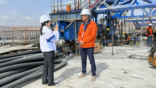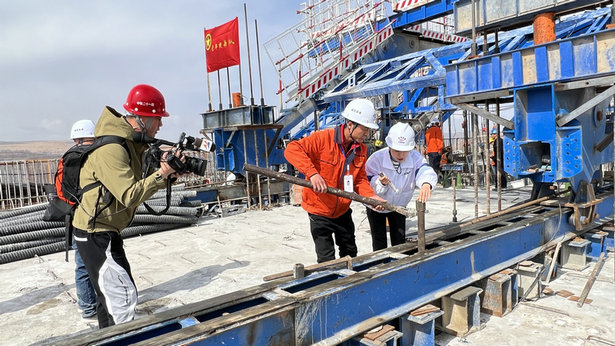 記者首先采訪了項目經(jīng)理,詢問并了解了任灣茹河特大橋的施工進度情況、施工難點以及選線意義。隨后,記者在項目經(jīng)理的陪同下來到特大橋的11#墩頂,項目經(jīng)理向記者詳細地介紹了更多有關(guān)任灣茹河特大橋的管理、日常作業(yè)、施工安全等信息,通過直播讓更多人了解到銀昆LJ12-2標(biāo)的重點工程建設(shè)情況。在到達墩頂后,記者采訪了技術(shù)員張治飛,了解了技術(shù)員的日常工作和目前正在攻堅的掛籃施工難點等情況。張治飛為記者介紹并演示了項目部組織研發(fā)的一種新套組,針對現(xiàn)場問題,這種新套組能夠極大地節(jié)本增效,而且申請了專利,之后能在更多標(biāo)段推廣運用。張治飛自豪地表示,自己身為彭陽本地人,非常期待銀昆高速的建成通車,可以將自己家鄉(xiāng)的美食特產(chǎn)帶到更多的地方,讓更多人了解彭陽、禮贊彭陽。