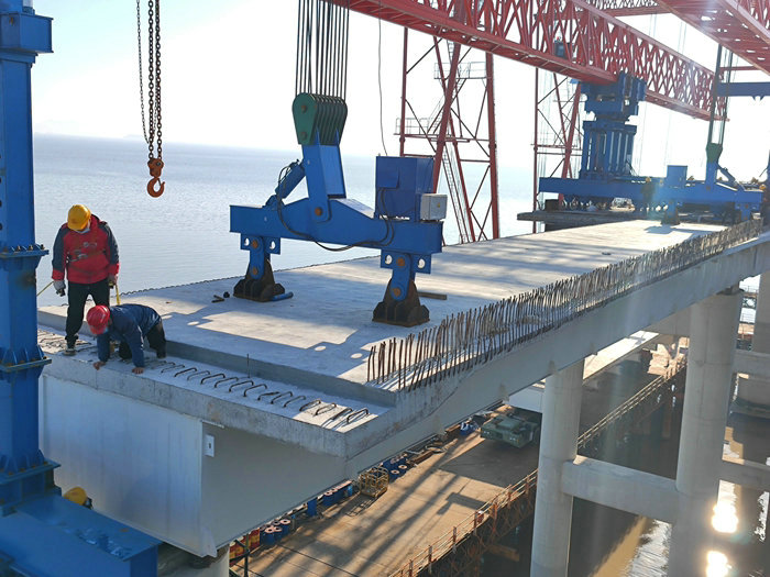 去年杭甬項目先后完成了樁基、承臺和橋墩等下部結(jié)構(gòu),并在具備條件的匝道同步架梁,向終點沖刺。開始從舟山通過公路運梁改為海上運輸,借用寧波石化區(qū)管委會的碼頭卸梁,汽車轉(zhuǎn)運到濱?;ネ?,走得是橢圓形的線路。這兩種方案都有弊端,一種是安全不可控,一旦在途中與并行車輛相撞或擦碰,后果不堪設(shè)想。后一種是運距遠、多一道裝卸程序,加上碼頭租賃費,成本太高,而且影響進度。為贏得運、卸、架時間,并確保安全,項目部制定了在互通區(qū)建卸梁站的方案,同時加緊組織人力和設(shè)備修建港池、安裝兩臺龍門吊。將方案報請寧波海事部門審核,去年10月下旬才獲批。濱海互通8條匝道、4條拼寬橋共計232跨470片鋼混疊合梁,去年因種種原因,只完成一部分架梁任務(wù),但順利完成了全年施工計劃。