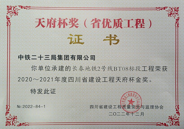 日前,筆者從中鐵二十三局獲悉,該公司承建的吉林省長春市地鐵2號線BT08標(biāo)段,榮獲 2020~2021年度四川省建設(shè)工程天府杯金獎(jiǎng)(省優(yōu)質(zhì)工程)。